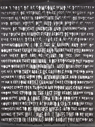 New text-based works quoting unanswered messages I sent on internet dating sites. These failed efforts to spark a connection are hand cut into various sheet materials, with the letters left dangling.