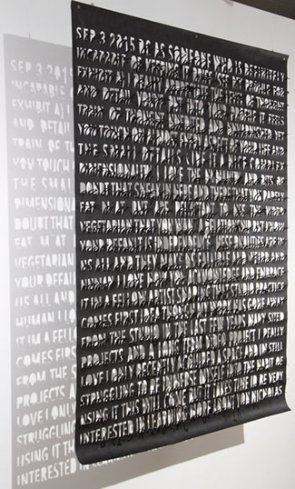 The messages cut into tyvek are warped and distorted, generating strange new forms. The stretched letters echo the author’s initial efforts to shape the message for its intended recipient.