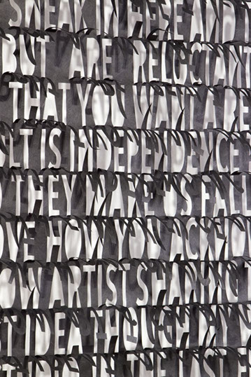 Thin and delicate, they are fastened only at the top, allowing the works to be responsive to the slightest breeze created by passing viewers. Individual letters flutter and shake, further activating the forms.