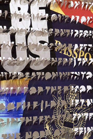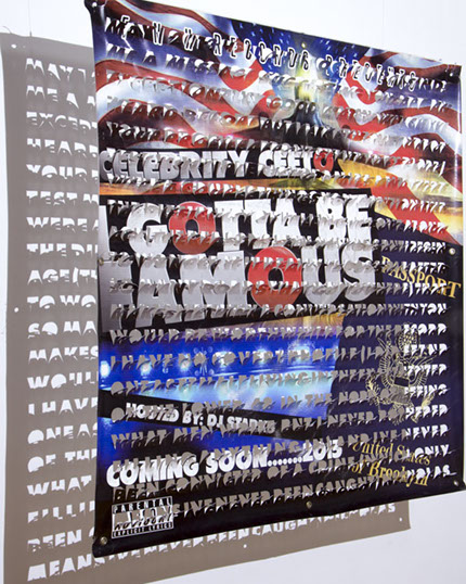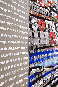 The printed banners are found objects advertising Rap, Reggae, Bollywood or other events, often with a dense pastiche of typography and a medley of artist faces printed on the surface. A ‘more is more’ aesthetic guides the designs, with vast quantities of information offered, far more than could be consumed by the passing motorists who constitute the primary audience. The dating messages are then cut into the material in dense blocks, forming a screen over the imagery. All the texts and images remain visible, but the holes and dangling letter-forms disrupt the ability to easily read or interpret any element. Coherence breaks down and the surface buzzes and vibrates.
