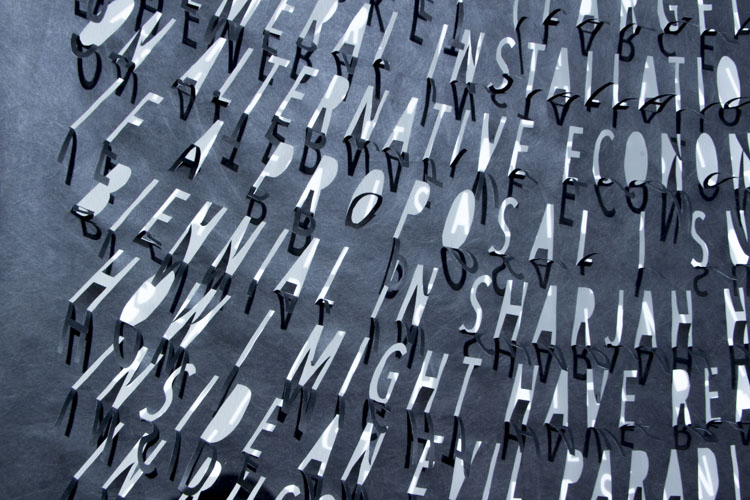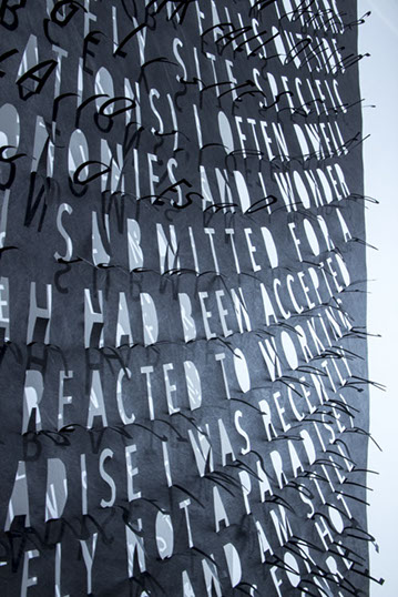 Thin and delicate, they are fastened only at the top, allowing the works to be responsive to the slightest breeze created by passing viewers. Individual letters flutter and shake, further activating the forms.