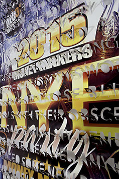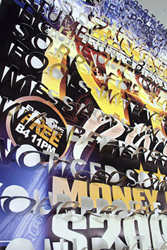 The printed banners are found objects advertising Rap, Reggae, Bollywood or other events, often with a dense pastiche of typography and a medley of artist faces printed on the surface. A ‘more is more’ aesthetic guides the designs, with vast quantities of information offered, far more than could be consumed by the passing motorists who constitute the primary audience. The dating messages are then cut into the material in dense blocks, forming a screen over the imagery. All the texts and images remain visible, but the holes and dangling letter-forms disrupt the ability to easily read or interpret any element. Coherence breaks down and the surface buzzes and vibrates.
