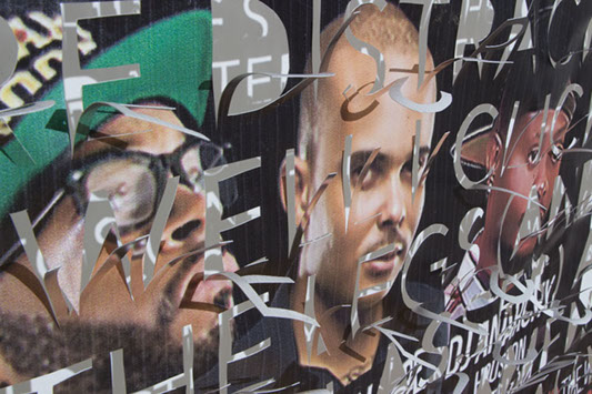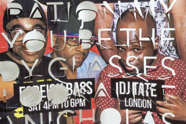 The printed banners are found objects advertising Rap, Reggae, Bollywood or other events, often with a dense pastiche of typography and a medley of artist faces printed on the surface. A ‘more is more’ aesthetic guides the designs, with vast quantities of information offered, far more than could be consumed by the passing motorists who constitute the primary audience. The dating messages are then cut into the material in dense blocks, forming a screen over the imagery. All the texts and images remain visible, but the holes and dangling letter-forms disrupt the ability to easily read or interpret any element. Coherence breaks down and the surface buzzes and vibrates.