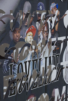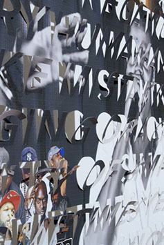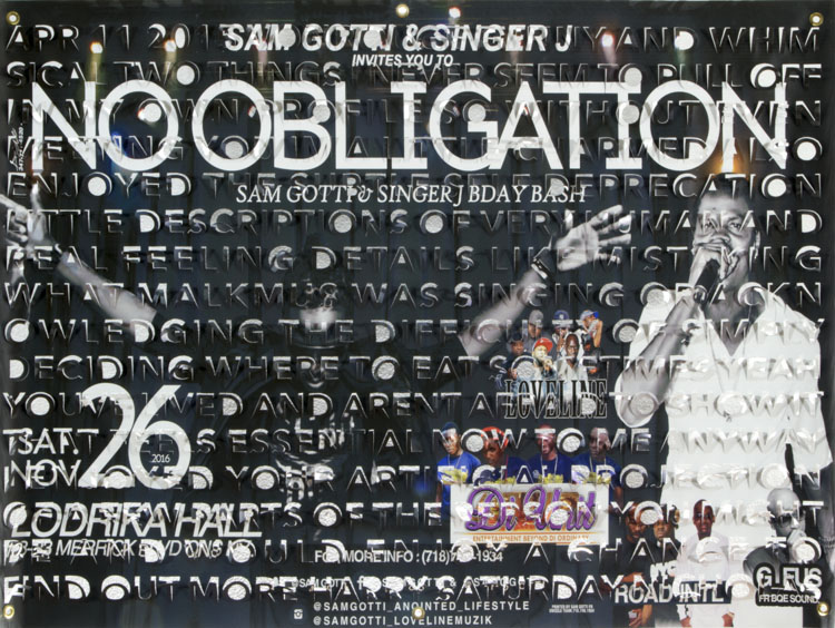 The printed banners are found objects advertising Rap, Reggae, Bollywood or other events, often with a dense pastiche of typography and a medley of artist faces printed on the surface. A ‘more is more’ aesthetic guides the designs, with vast quantities of information offered, far more than could be consumed by the passing motorists who constitute the primary audience. The dating messages are then cut into the material in dense blocks, forming a screen over the imagery. All the texts and images remain visible, but the holes and dangling letter-forms disrupt the ability to easily read or interpret any element. Coherence breaks down and the surface buzzes and vibrates.