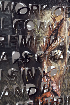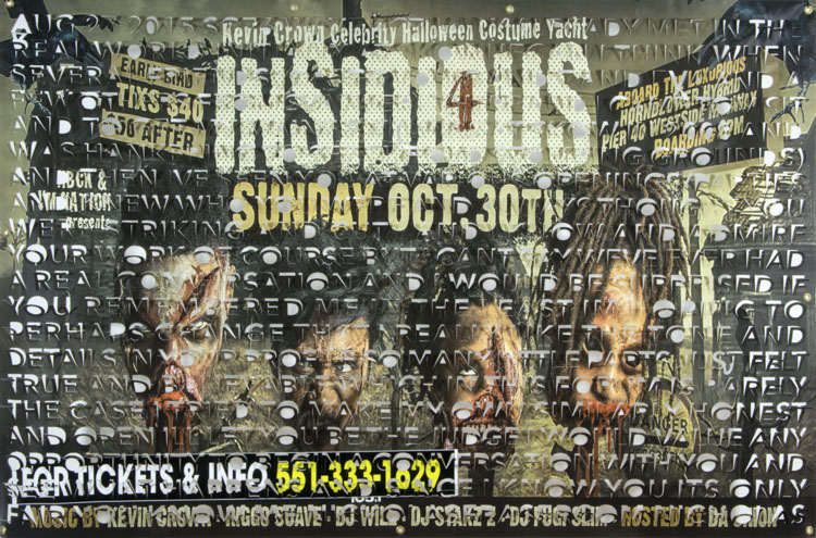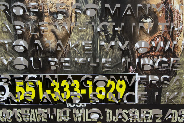 The printed banners are found objects advertising Rap, Reggae, Bollywood or other events, often with a dense pastiche of typography and a medley of artist faces printed on the surface. A ‘more is more’ aesthetic guides the designs, with vast quantities of information offered, far more than could be consumed by the passing motorists who constitute the primary audience. The dating messages are then cut into the material in dense blocks, forming a screen over the imagery. All the texts and images remain visible, but the holes and dangling letter-forms disrupt the ability to easily read or interpret any element. Coherence breaks down and the surface buzzes and vibrates.