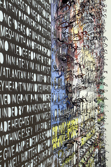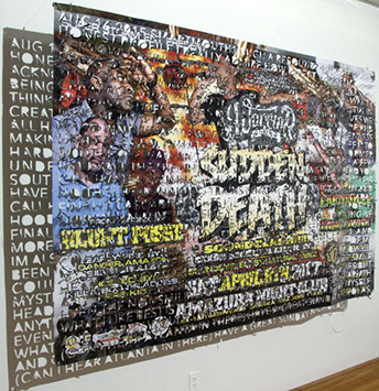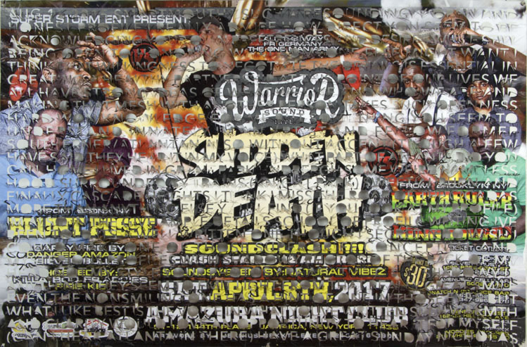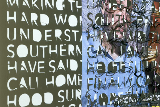 The printed banners are found objects advertising Rap, Reggae, Bollywood or other events, often with a dense pastiche of typography and a medley of artist faces printed on the surface. A ‘more is more’ aesthetic guides the designs, with vast quantities of information offered, far more than could be consumed by the passing motorists who constitute the primary audience. The dating messages are then cut into the material in dense blocks, forming a screen over the imagery. All the texts and images remain visible, but the holes and dangling letter-forms disrupt the ability to easily read or interpret any element. Coherence breaks down and the surface buzzes and vibrates.