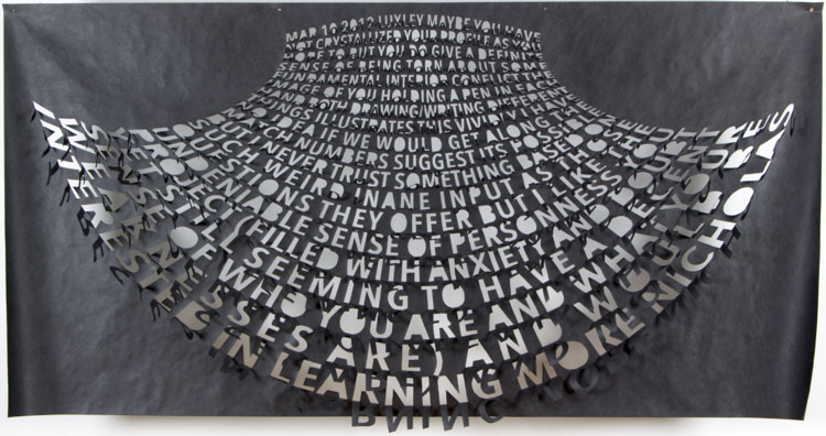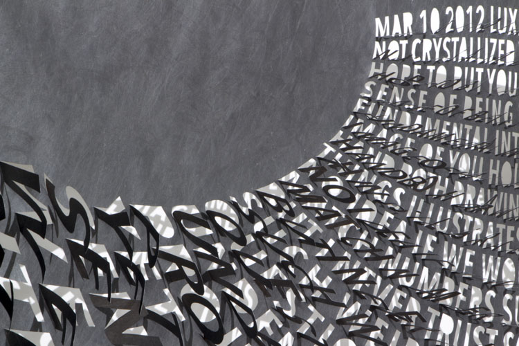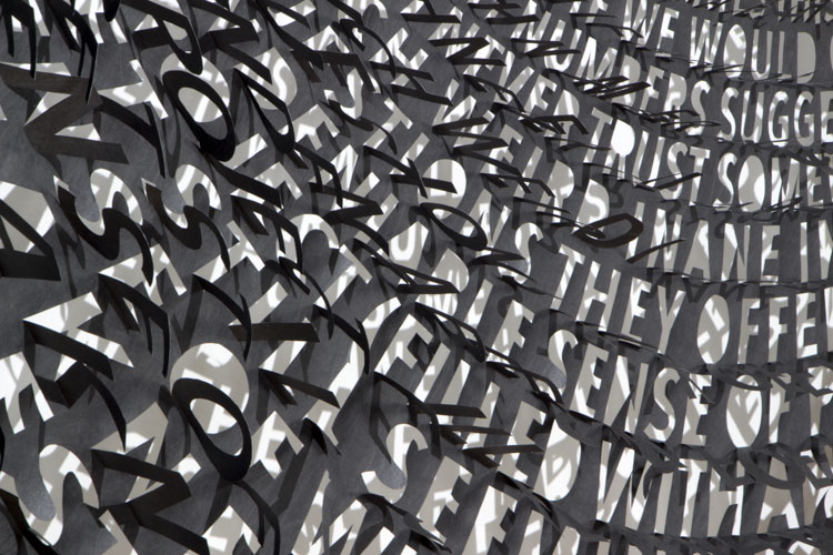 Thin and delicate, they are fastened only at the top, allowing the works to be responsive to the slightest breeze created by passing viewers. Individual letters flutter and shake, further activating the forms.