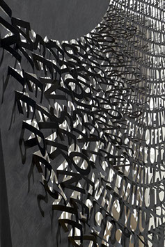 Thin and delicate and fastened only at the top, the viewer’s movements cause the material to ripple, individual letters to flutter and shake, further activating the forms.