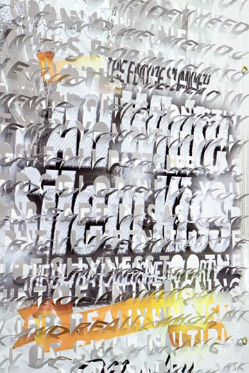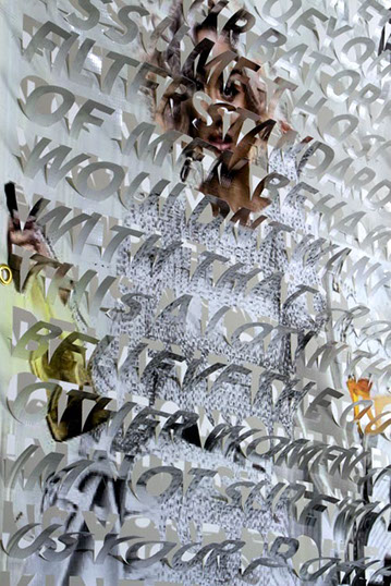 The printed banners are found objects advertising Rap, Reggae, Bollywood or other events, often with a dense pastiche of typography and a medley of artist faces printed on the surface. A ‘more is more’ aesthetic guides the designs, with vast quantities of information offered, far more than could be consumed by the passing motorists who constitute the primary audience. The dating messages are then cut into the material in dense blocks, forming a screen over the imagery. All the texts and images remain visible, but the holes and dangling letter-forms disrupt the ability to easily read or interpret any element. Coherence breaks down and the surface buzzes and vibrates.