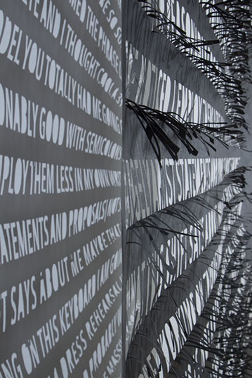 Thin and delicate and fastened only at the top, the viewer’s movements cause the material to ripple, individual letters to flutter and shake, further activating the forms.
