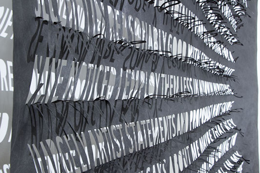Thin and delicate, they are fastened only at the top, allowing the works to be responsive to the slightest breeze created by passing viewers. Individual letters flutter and shake, further activating the forms.