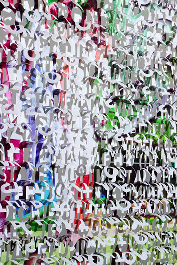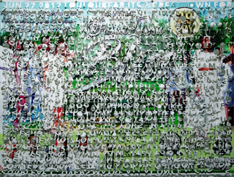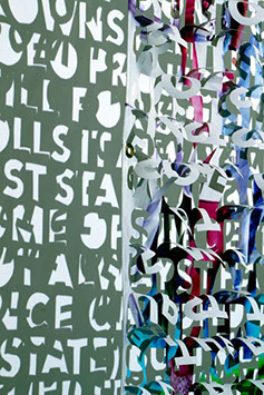 The printed banners are found objects advertising Rap, Reggae, Bollywood or other events, often with a dense pastiche of typography and a medley of artist faces printed on the surface. A ‘more is more’ aesthetic guides the designs, with vast quantities of information offered, far more than could be consumed by the passing motorists who constitute the primary audience. The dating messages are then cut into the material in dense blocks, forming a screen over the imagery. All the texts and images remain visible, but the holes and dangling letter-forms disrupt the ability to easily read or interpret any element. Coherence breaks down and the surface buzzes and vibrates.