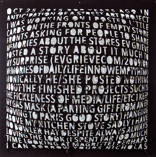 The messages cut into tyvek are warped and distorted, generating strange new forms. The stretched letters echo the author’s initial efforts to shape the message for its intended recipient.