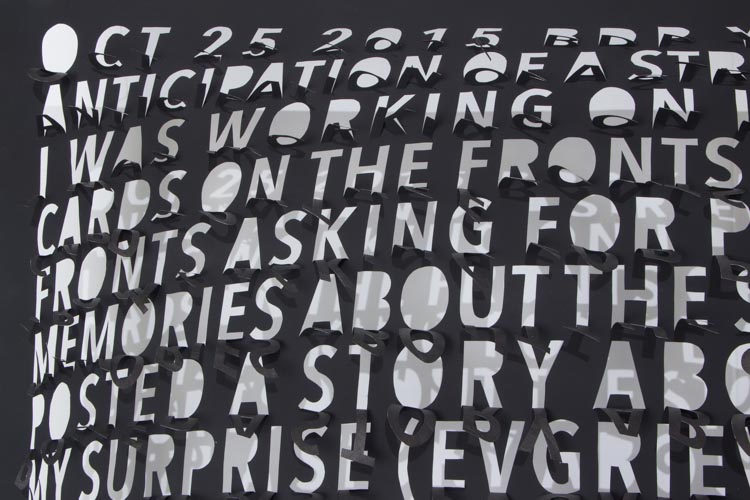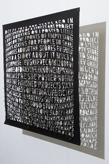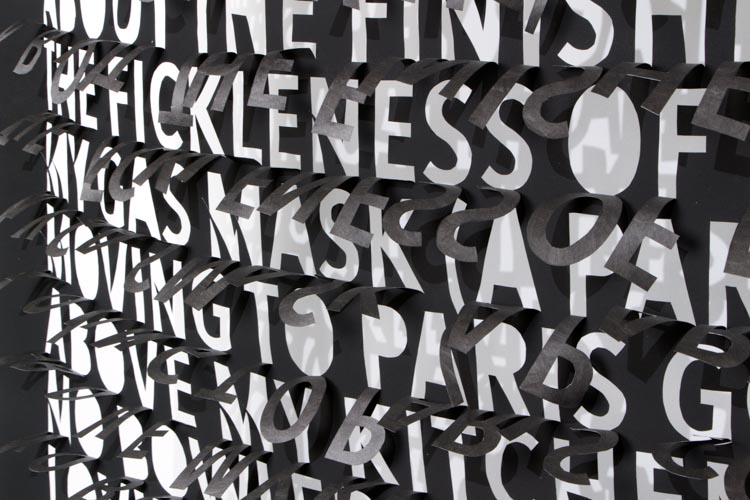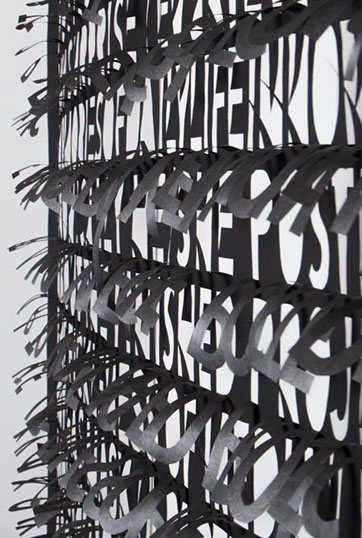 Thin and delicate, they are fastened only at the top, allowing the works to be responsive to the slightest breeze created by passing viewers. Individual letters flutter and shake, further activating the forms.