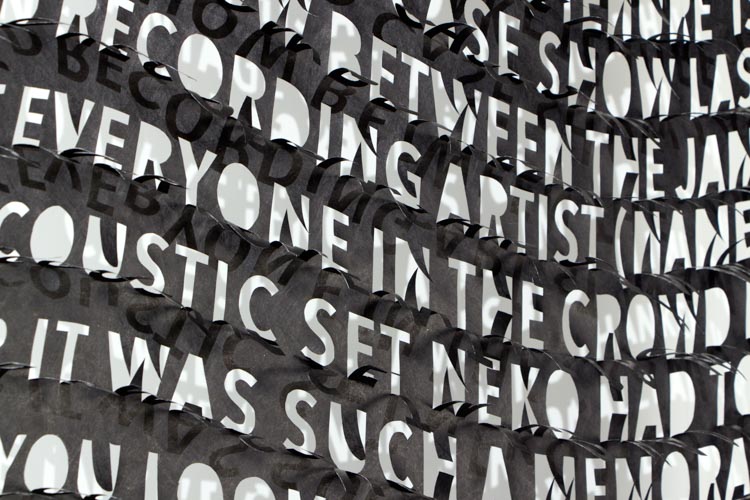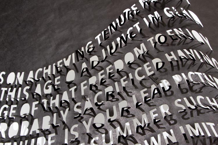 Thin and delicate, they are fastened only at the top, allowing the works to be responsive to the slightest breeze created by passing viewers. Individual letters flutter and shake, further activating the forms.