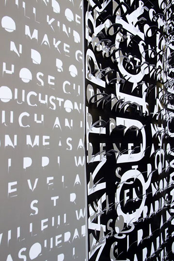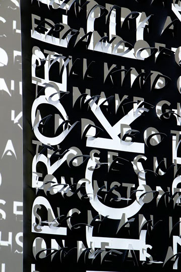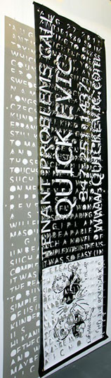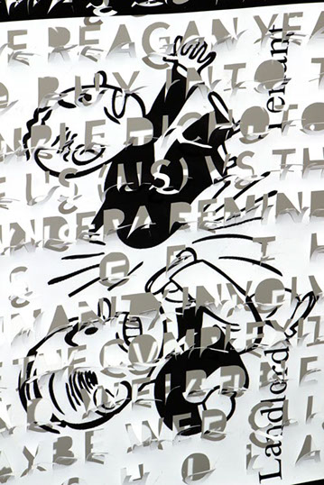 The printed banners are found objects advertising Rap, Reggae, Bollywood or other events, often with a dense pastiche of typography and a medley of artist faces printed on the surface. A ‘more is more’ aesthetic guides the designs, with vast quantities of information offered, far more than could be consumed by the passing motorists who constitute the primary audience. The dating messages are then cut into the material in dense blocks, forming a screen over the imagery. All the texts and images remain visible, but the holes and dangling letter-forms disrupt the ability to easily read or interpret any element. Coherence breaks down and the surface buzzes and vibrates.