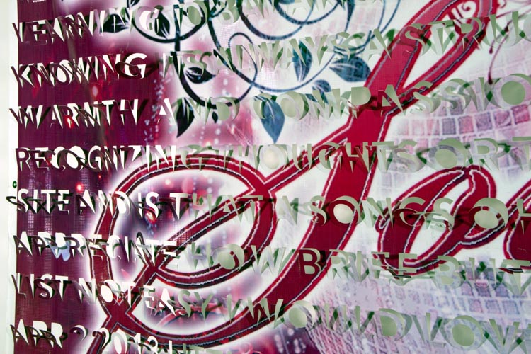 The printed banners are found objects advertising Rap, Reggae, Bollywood or other events, often with a dense pastiche of typography and a medley of artist faces printed on the surface. A ‘more is more’ aesthetic guides the designs, with vast quantities of information offered, far more than could be consumed by the passing motorists who constitute the primary audience. The dating messages are then cut into the material in dense blocks, forming a screen over the imagery. All the texts and images remain visible, but the holes and dangling letter-forms disrupt the ability to easily read or interpret any element. Coherence breaks down and the surface buzzes and vibrates.