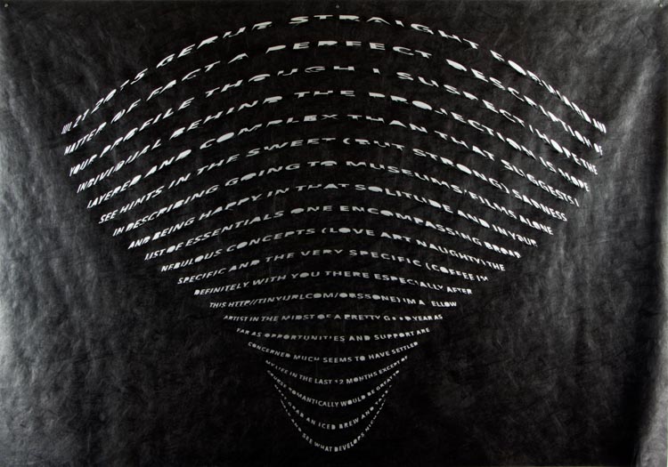 New text-based works quoting unanswered messages I sent on internet dating sites. These failed efforts to spark a connection are hand cut into various sheet materials, with the letters left dangling.