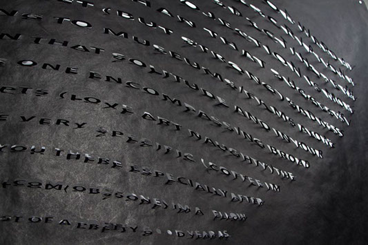 Thin and delicate, they are fastened only at the top, allowing the works to be responsive to the slightest breeze created by passing viewers. Individual letters flutter and shake, further activating the forms.