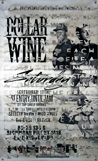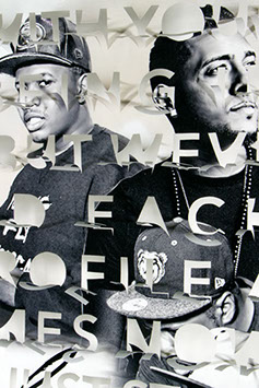 The printed banners are found objects advertising Rap, Reggae, Bollywood or other events, often with a dense pastiche of typography and a medley of artist faces printed on the surface. A ‘more is more’ aesthetic guides the designs, with vast quantities of information offered, far more than could be consumed by the passing motorists who constitute the primary audience. The dating messages are then cut into the material in dense blocks, forming a screen over the imagery. All the texts and images remain visible, but the holes and dangling letter-forms disrupt the ability to easily read or interpret any element. Coherence breaks down and the surface buzzes and vibrates.
