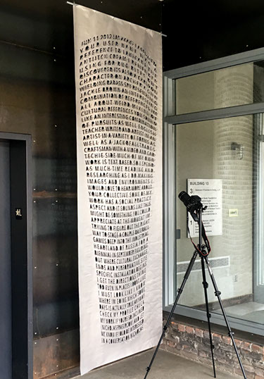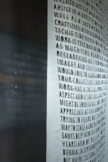 Thin and delicate and fastened only at the top, the viewer’s movements cause the material to ripple, individual letters to flutter and shake, further activating the forms.