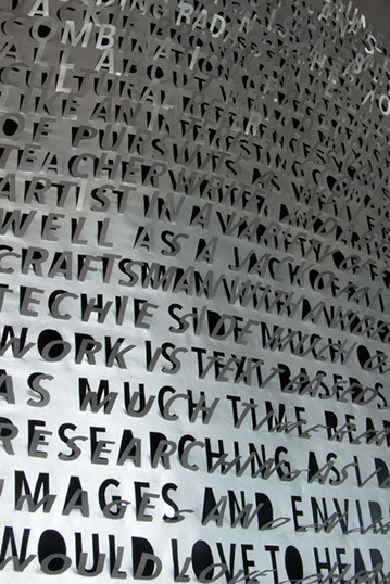 Thin and delicate, they are fastened only at the top, allowing the works to be responsive to the slightest breeze created by passing viewers. Individual letters flutter and shake, further activating the forms.