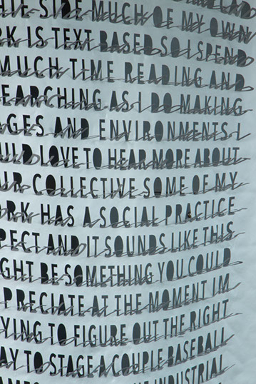 Warped and wrapped, the tyvek messages generate illusionistic shadow forms. The stretched letters echo the author’s initial efforts to shape the message for its intended recipient.