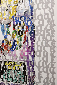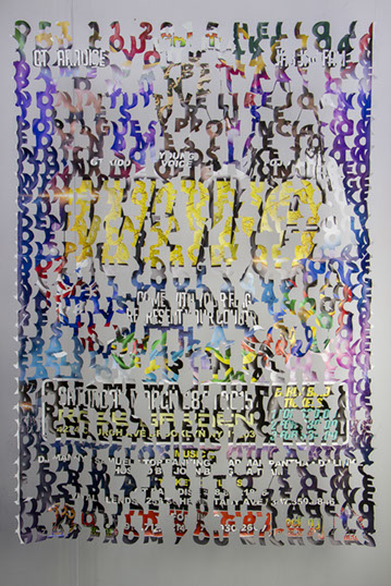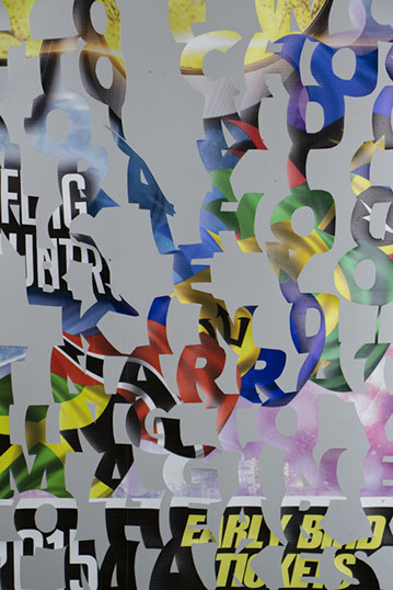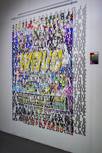 The printed banners are found objects advertising Rap, Reggae, Bollywood or other events, often with a dense pastiche of typography and a medley of artist faces printed on the surface. A ‘more is more’ aesthetic guides the designs, with vast quantities of information offered, far more than could be consumed by the passing motorists who constitute the primary audience. The dating messages are then cut into the material in dense blocks, forming a screen over the imagery. All the texts and images remain visible, but the holes and dangling letter-forms disrupt the ability to easily read or interpret any element. Coherence breaks down and the surface buzzes and vibrates.