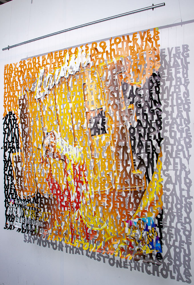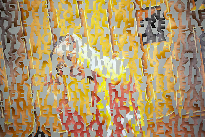 The printed banners are found objects advertising Rap, Reggae, Bollywood or other events, often with a dense pastiche of typography and a medley of artist faces printed on the surface. A ‘more is more’ aesthetic guides the designs, with vast quantities of information offered, far more than could be consumed by the passing motorists who constitute the primary audience. The dating messages are then cut into the material in dense blocks, forming a screen over the imagery. All the texts and images remain visible, but the holes and dangling letter-forms disrupt the ability to easily read or interpret any element. Coherence breaks down and the surface buzzes and vibrates.