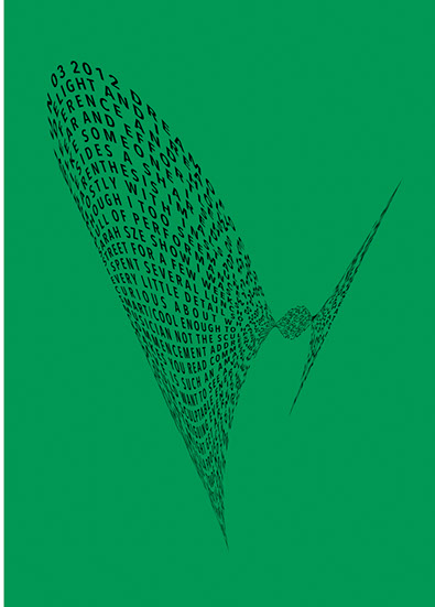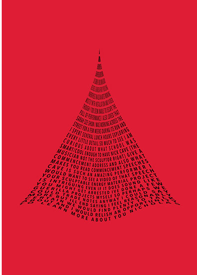 For each triptych, a single unanswered message is digitally manipulated into three unique sculptural forms and printed on individual sheets. Each twisting form obscures parts of the message, requiring the viewer to read across the three shaped texts to piece the message together. The red/green/blue surfaces underscore the digital origin of the messages.