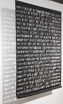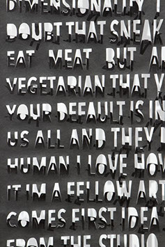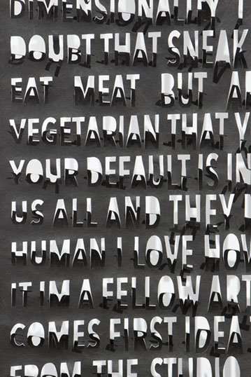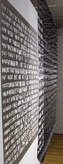 Thin and delicate, they are fastened only at the top, allowing the works to be responsive to the slightest breeze created by passing viewers. Individual letters flutter and shake, further activating the forms.