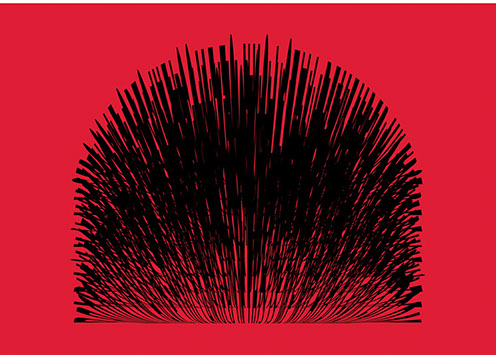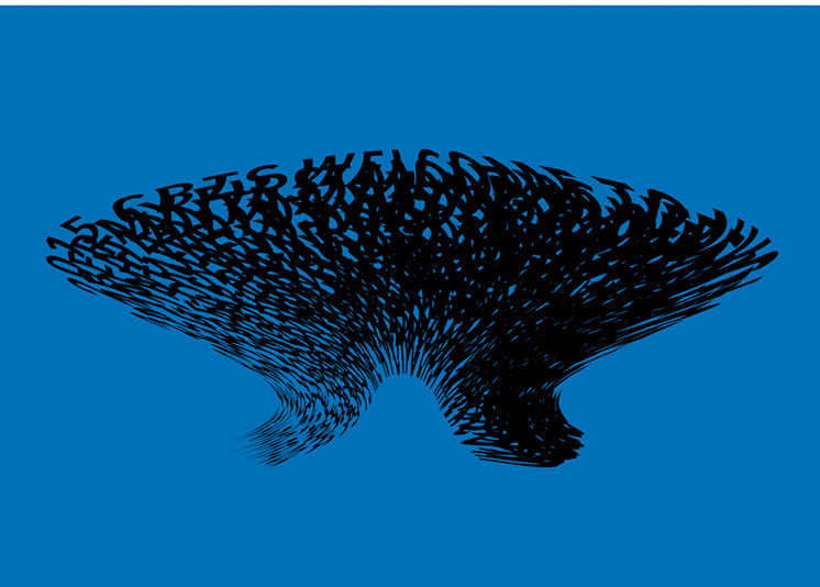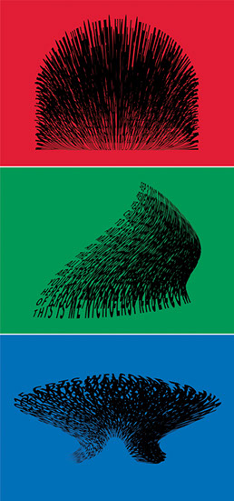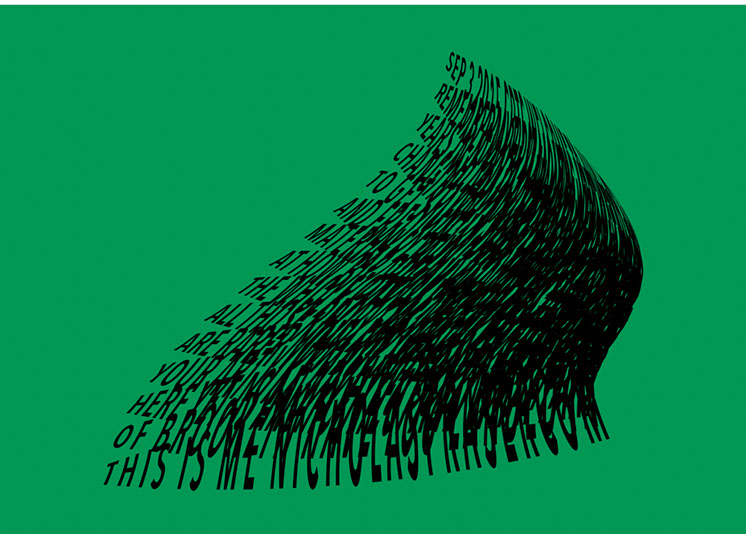 For each triptych, a single unanswered message is digitally manipulated into three unique sculptural forms and printed on individual sheets. Each twisting form obscures parts of the message, requiring the viewer to read across the three shaped texts to piece the message together. The red/green/blue surfaces underscore the digital origin of the messages.