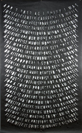 New text-based works quoting unanswered messages I sent on internet dating sites. These failed efforts to spark a connection are hand cut into various sheet materials, with the letters left dangling.
