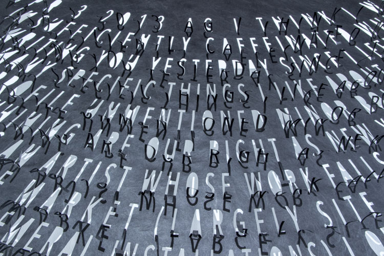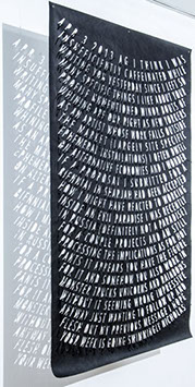 Thin and delicate, they are fastened only at the top, allowing the works to be responsive to the slightest breeze created by passing viewers. Individual letters flutter and shake, further activating the forms.