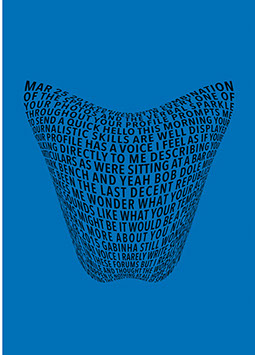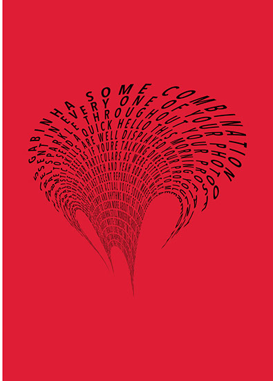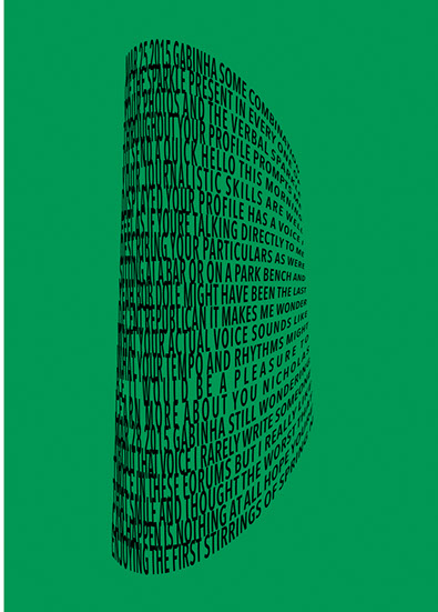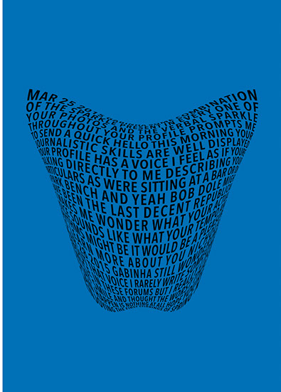 For each triptych, a single unanswered message is digitally manipulated into three unique sculptural forms and printed on individual sheets. Each twisting form obscures parts of the message, requiring the viewer to read across the three shaped texts to piece the message together. The red/green/blue surfaces underscore the digital origin of the messages.
