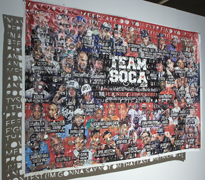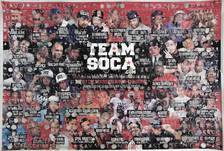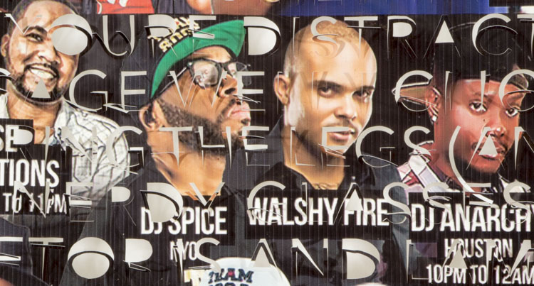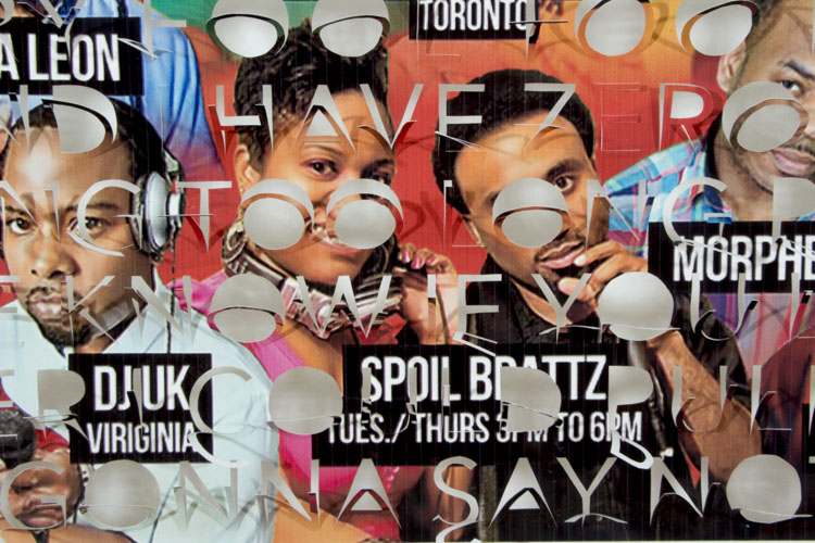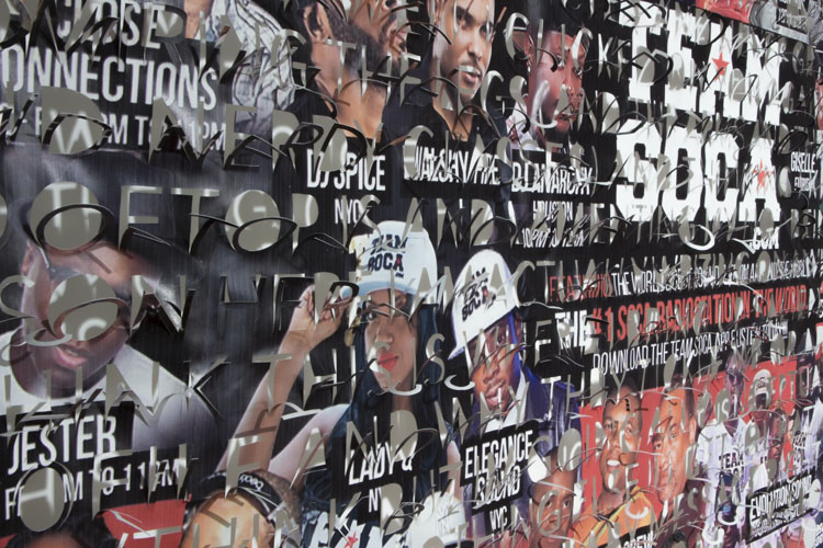 The printed banners are found objects advertising Rap, Reggae, Bollywood or other events, often with a dense pastiche of typography and a medley of artist faces printed on the surface. A ‘more is more’ aesthetic guides the designs, with vast quantities of information offered, far more than could be consumed by the passing motorists who constitute the primary audience. The dating messages are then cut into the material in dense blocks, forming a screen over the imagery. All the texts and images remain visible, but the holes and dangling letter-forms disrupt the ability to easily read or interpret any element. Coherence breaks down and the surface buzzes and vibrates.
