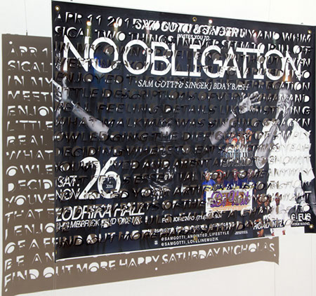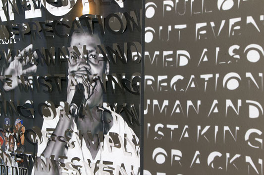 The printed banners are found objects advertising Rap, Reggae, Bollywood or other events, often with a dense pastiche of typography and a medley of artist faces printed on the surface. A ‘more is more’ aesthetic guides the designs, with vast quantities of information offered, far more than could be consumed by the passing motorists who constitute the primary audience. The dating messages are then cut into the material in dense blocks, forming a screen over the imagery. All the texts and images remain visible, but the holes and dangling letter-forms disrupt the ability to easily read or interpret any element. Coherence breaks down and the surface buzzes and vibrates.
