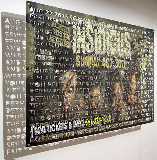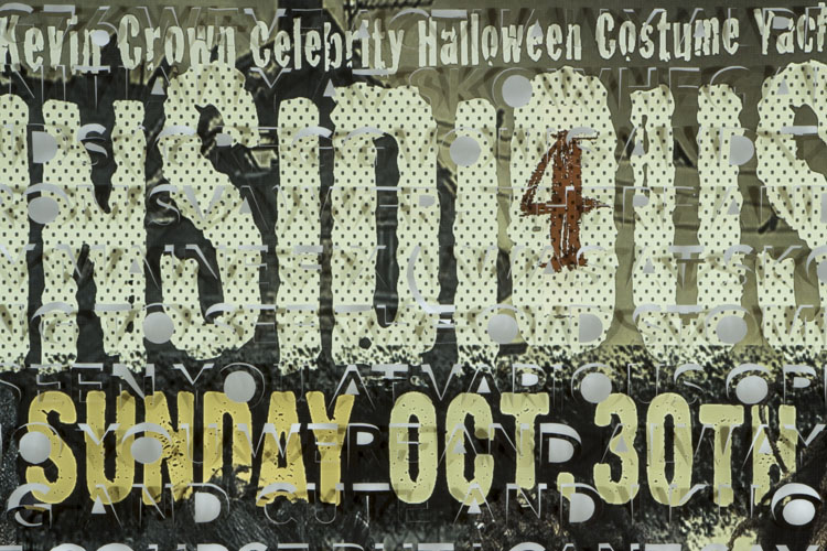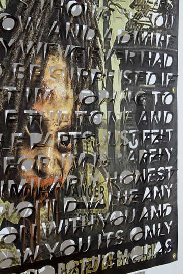 The printed banners are found objects advertising Rap, Reggae, Bollywood or other events, often with a dense pastiche of typography and a medley of artist faces printed on the surface. A ‘more is more’ aesthetic guides the designs, with vast quantities of information offered, far more than could be consumed by the passing motorists who constitute the primary audience. The dating messages are then cut into the material in dense blocks, forming a screen over the imagery. All the texts and images remain visible, but the holes and dangling letter-forms disrupt the ability to easily read or interpret any element. Coherence breaks down and the surface buzzes and vibrates.