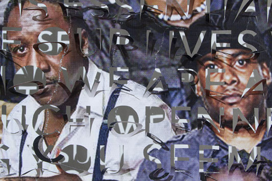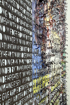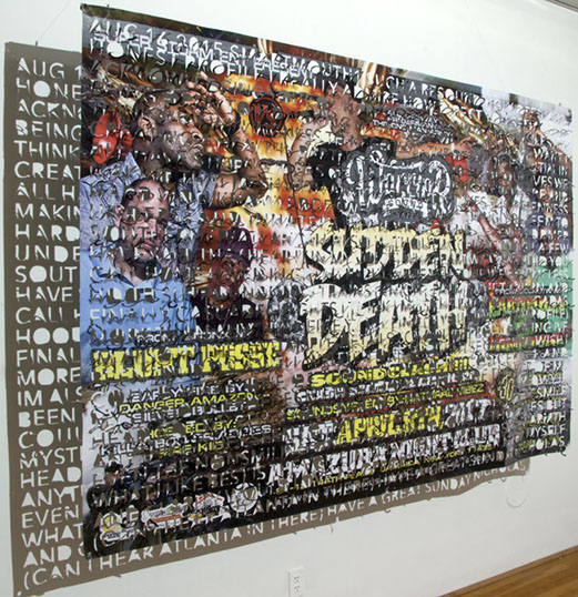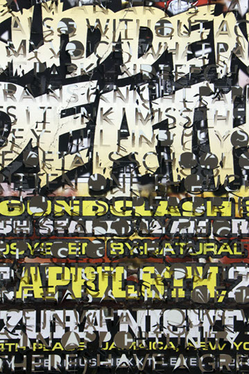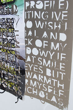 The printed banners are found objects advertising Rap, Reggae, Bollywood or other events, often with a dense pastiche of typography and a medley of artist faces printed on the surface. A ‘more is more’ aesthetic guides the designs, with vast quantities of information offered, far more than could be consumed by the passing motorists who constitute the primary audience. The dating messages are then cut into the material in dense blocks, forming a screen over the imagery. All the texts and images remain visible, but the holes and dangling letter-forms disrupt the ability to easily read or interpret any element. Coherence breaks down and the surface buzzes and vibrates.
