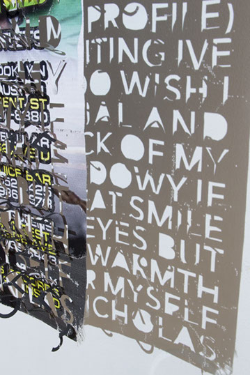 Overlaying dating site messages onto banners merges two forms of advertising, two carefully crafted projections intent on moving an audience to action. Both undergo a functional shift in the process: the once private messages are writ large and hung for all to see, reveling/wallowing in a peculiar contemporary phenomenon and its inevitable failures. The banners, having served their initial purpose, remain artifacts of the city’s vibrant cultural landscape but are transformed into something reflecting the multi-layered, everything-at-once nature of that landscape, it’s private layers and public proclamations merged into a singular cacophonous display.
