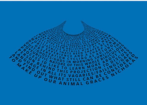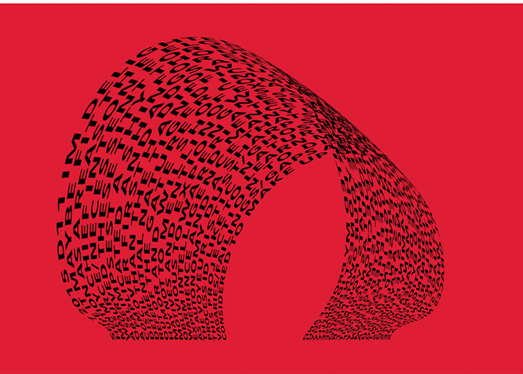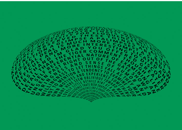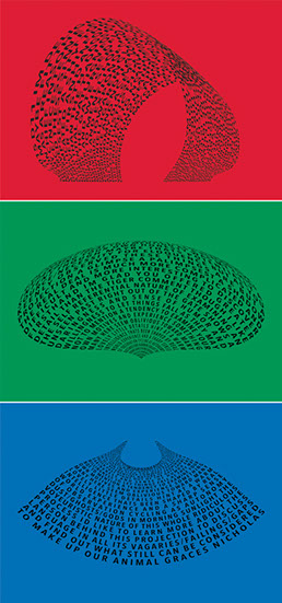 For each triptych, a single unanswered message is digitally manipulated into three unique sculptural forms and printed on individual sheets. Each twisting form obscures parts of the message, requiring the viewer to read across the three shaped texts to piece the message together. The red/green/blue surfaces underscore the digital origin of the messages.