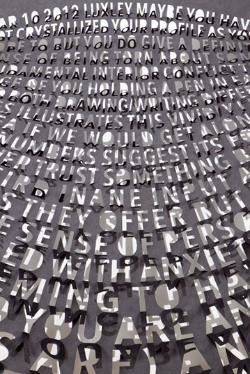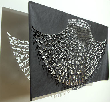 Thin and delicate, they are fastened only at the top, allowing the works to be responsive to the slightest breeze created by passing viewers. Individual letters flutter and shake, further activating the forms.