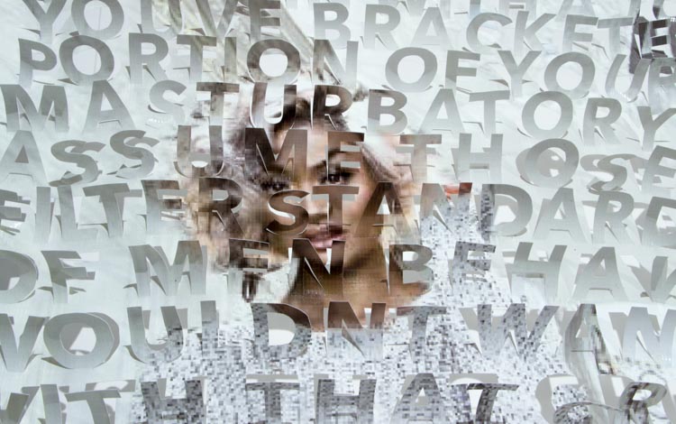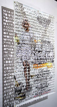 The printed banners are found objects advertising Rap, Reggae, Bollywood or other events, often with a dense pastiche of typography and a medley of artist faces printed on the surface. A ‘more is more’ aesthetic guides the designs, with vast quantities of information offered, far more than could be consumed by the passing motorists who constitute the primary audience. The dating messages are then cut into the material in dense blocks, forming a screen over the imagery. All the texts and images remain visible, but the holes and dangling letter-forms disrupt the ability to easily read or interpret any element. Coherence breaks down and the surface buzzes and vibrates.