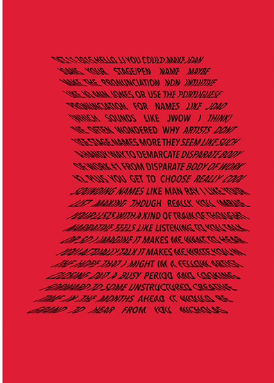 For each triptych, a single unanswered message is digitally manipulated into three unique sculptural forms and printed on individual sheets. Each twisting form obscures parts of the message, requiring the viewer to read across the three shaped texts to piece the message together. The red/green/blue surfaces underscore the digital origin of the messages.