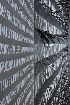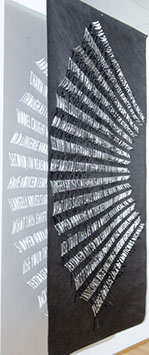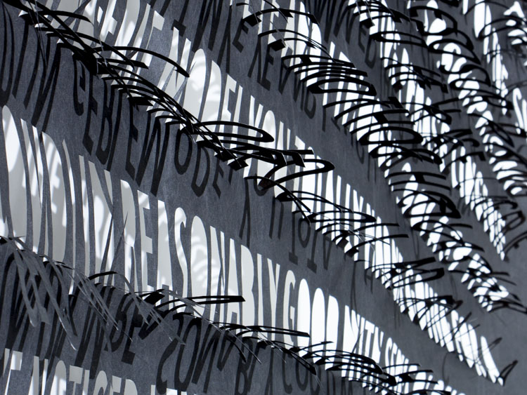 Thin and delicate, they are fastened only at the top, allowing the works to be responsive to the slightest breeze created by passing viewers. Individual letters flutter and shake, further activating the forms.