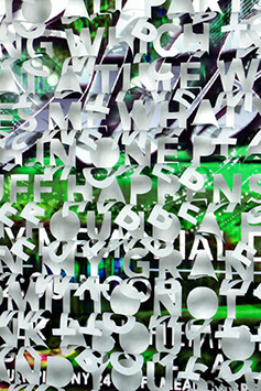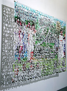 The printed banners are found objects advertising Rap, Reggae, Bollywood or other events, often with a dense pastiche of typography and a medley of artist faces printed on the surface. A ‘more is more’ aesthetic guides the designs, with vast quantities of information offered, far more than could be consumed by the passing motorists who constitute the primary audience. The dating messages are then cut into the material in dense blocks, forming a screen over the imagery. All the texts and images remain visible, but the holes and dangling letter-forms disrupt the ability to easily read or interpret any element. Coherence breaks down and the surface buzzes and vibrates.