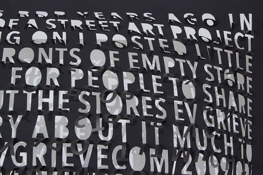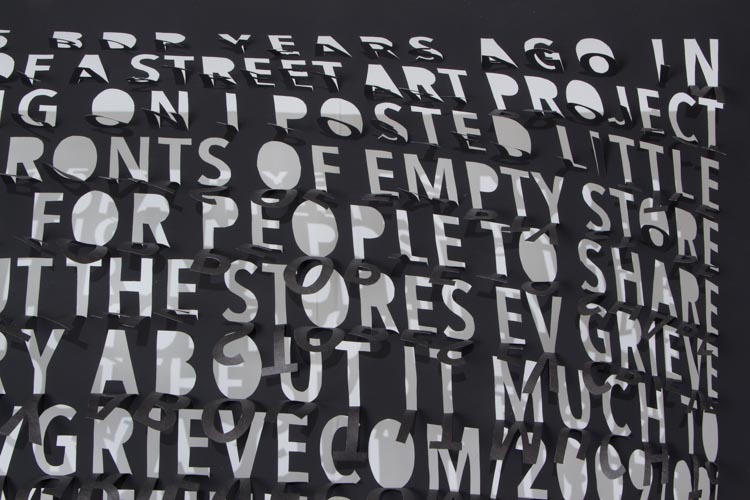 Thin and delicate, they are fastened only at the top, allowing the works to be responsive to the slightest breeze created by passing viewers. Individual letters flutter and shake, further activating the forms.