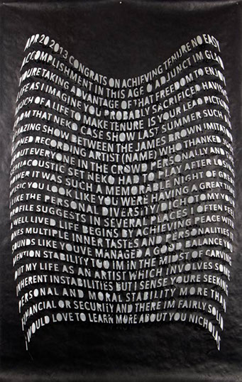 Warped and wrapped, the tyvek messages generate illusionistic shadow forms. The stretched letters echo the author’s initial efforts to shape the message for its intended recipient.