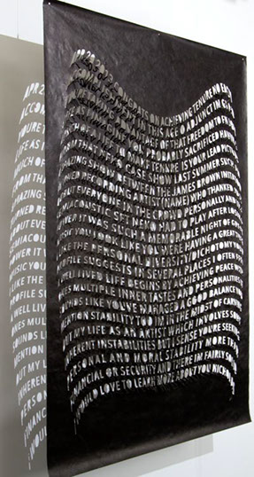 Thin and delicate, they are fastened only at the top, allowing the works to be responsive to the slightest breeze created by passing viewers. Individual letters flutter and shake, further activating the forms.
