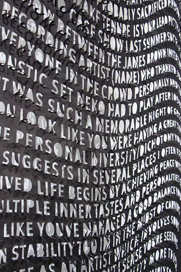 Thin and delicate and fastened only at the top, the viewer’s movements cause the material to ripple, individual letters to flutter and shake, further activating the forms.